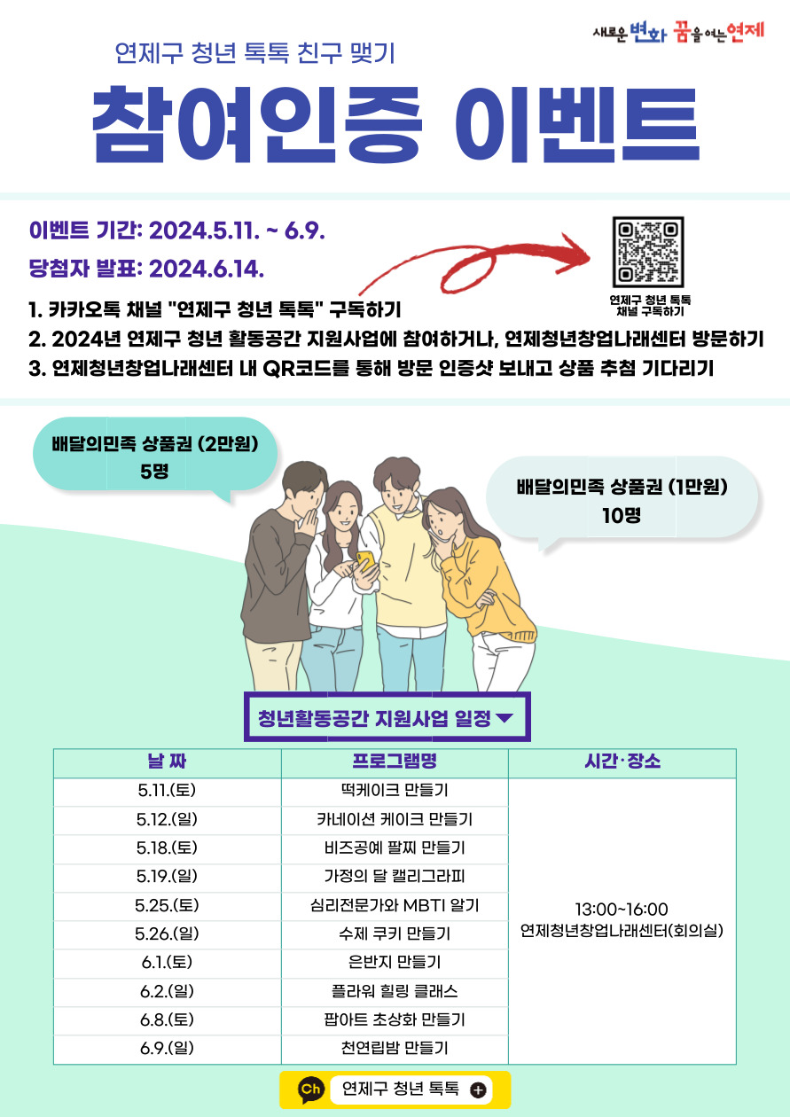 공지사항 [연제청년창업나래센터×연제 청년 톡톡] 참여인증 이벤트! 관리자 2024.05.10 581 연제구-청년-톡톡-친구이벤트 수정본.jpg 다운로드 2024.5.11~2024.6.9 까지 참여인증 이벤트 중이오니, 여러분의 많은 참여 부탁드립니다~! 이전글 [청년마루] 2024 동네 청년활동공간 활성화 지원사업_입사지원서 컨설팅+MBTI+취업역량강화 교육 다음글 다음 게시물이 없습니다. 목록으로